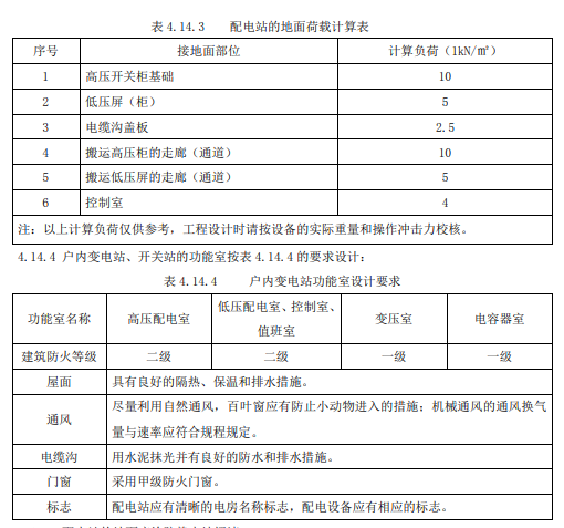 4.14.3配電站的地面按表4.14.3計算荷載:4.14.5配電站的地面應涂防靜電地坪漆。防靜電漆施工工藝:1、地面處理:依據地面狀況做好打磨、修補、除污、除塵:2、防靜電底漆:采用滲透性及附著力特強防靜電底漆滾涂一道,增強表面附著力:3、銅箔鋪設:用導電銅箔全面鋪設一道:4、防靜電秒漿:將防靜電組份加入石英砂,用慢刀將其均勻徐布多道:5、防靜電膩子:用防靜電組份加入適量膩子粉,用慢刀將其均勻涂布多道:6、防靜電面漆:用防靜電面漆滾涂或用防靜電自流平饅涂:7、地坪投入使用時間:以250C為準,24小時后方可上人,72小時后方可重壓。